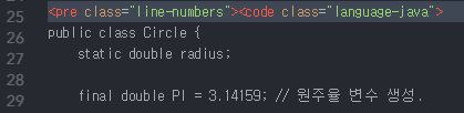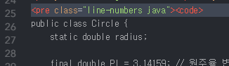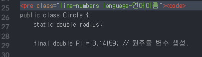 <pre class="line-numbers"><code class="language-언어이름">코드입력</code></pre>