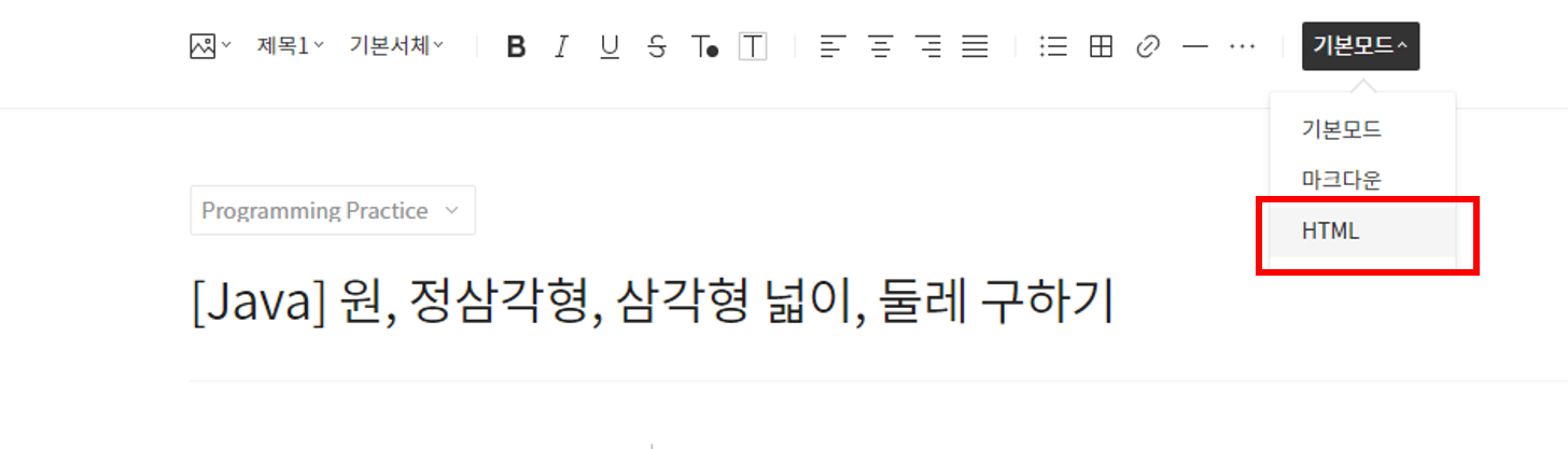 글을 쓸 때 그림1 기본 모드에서 HTML로 선택합니다.