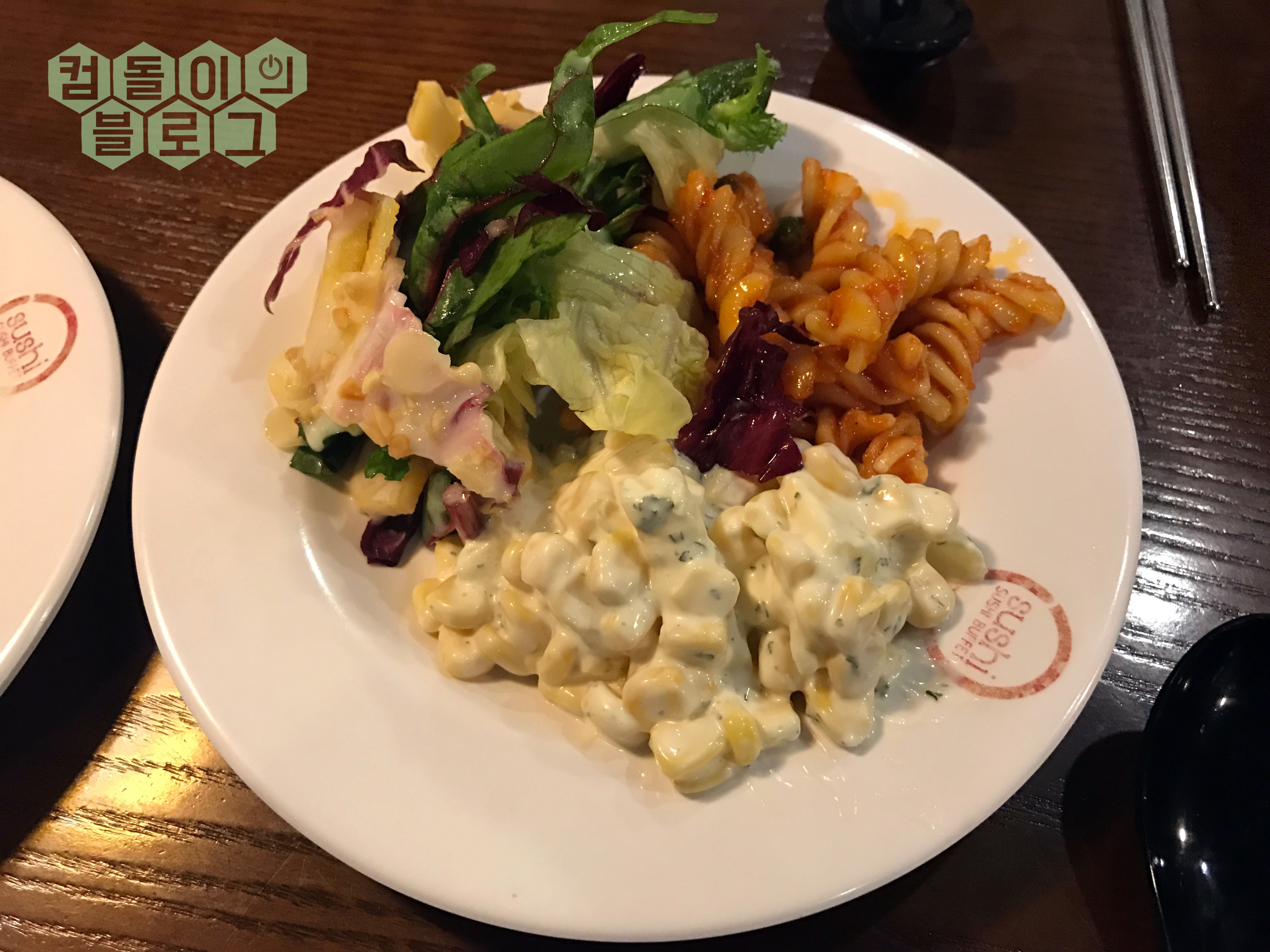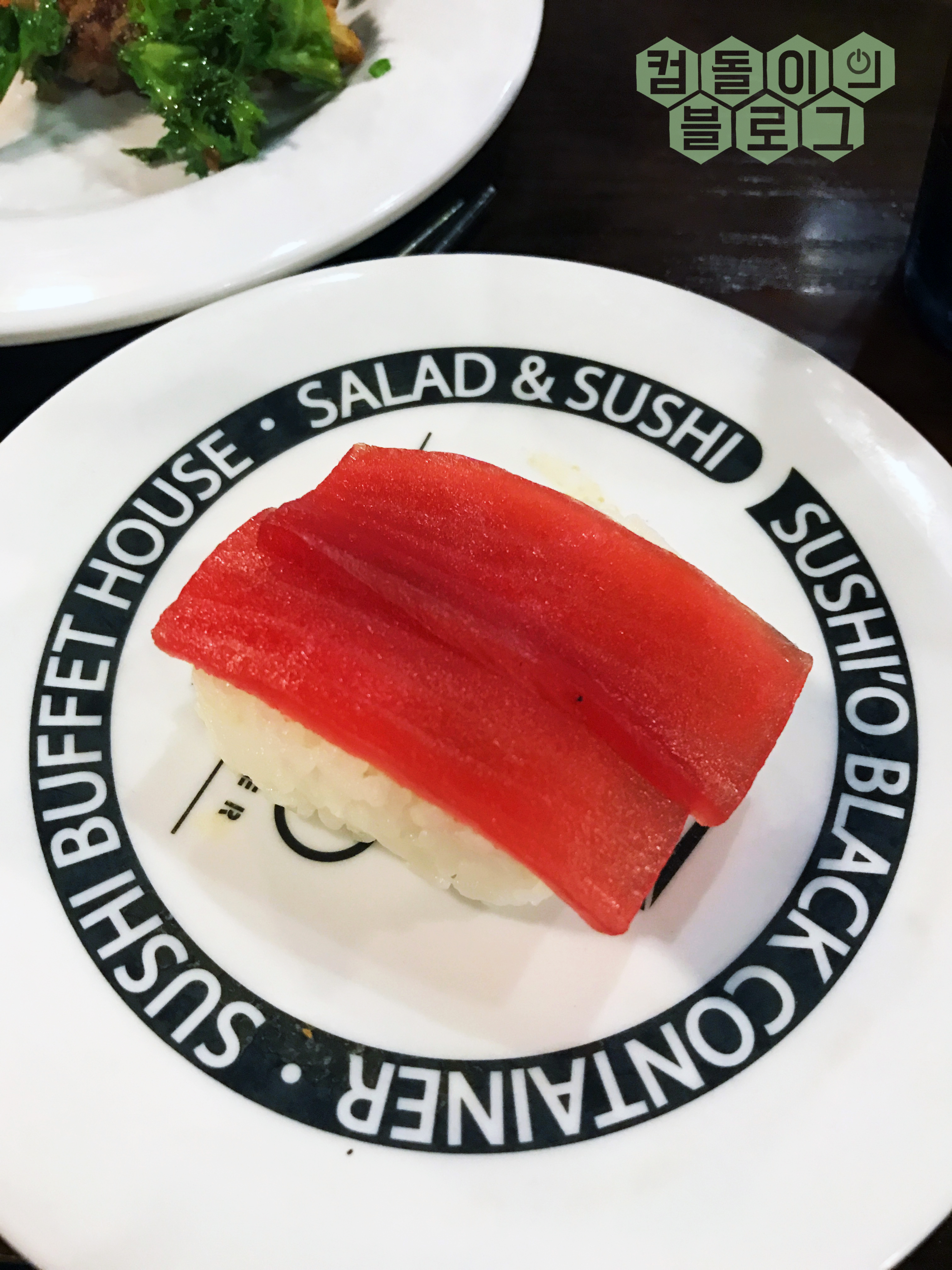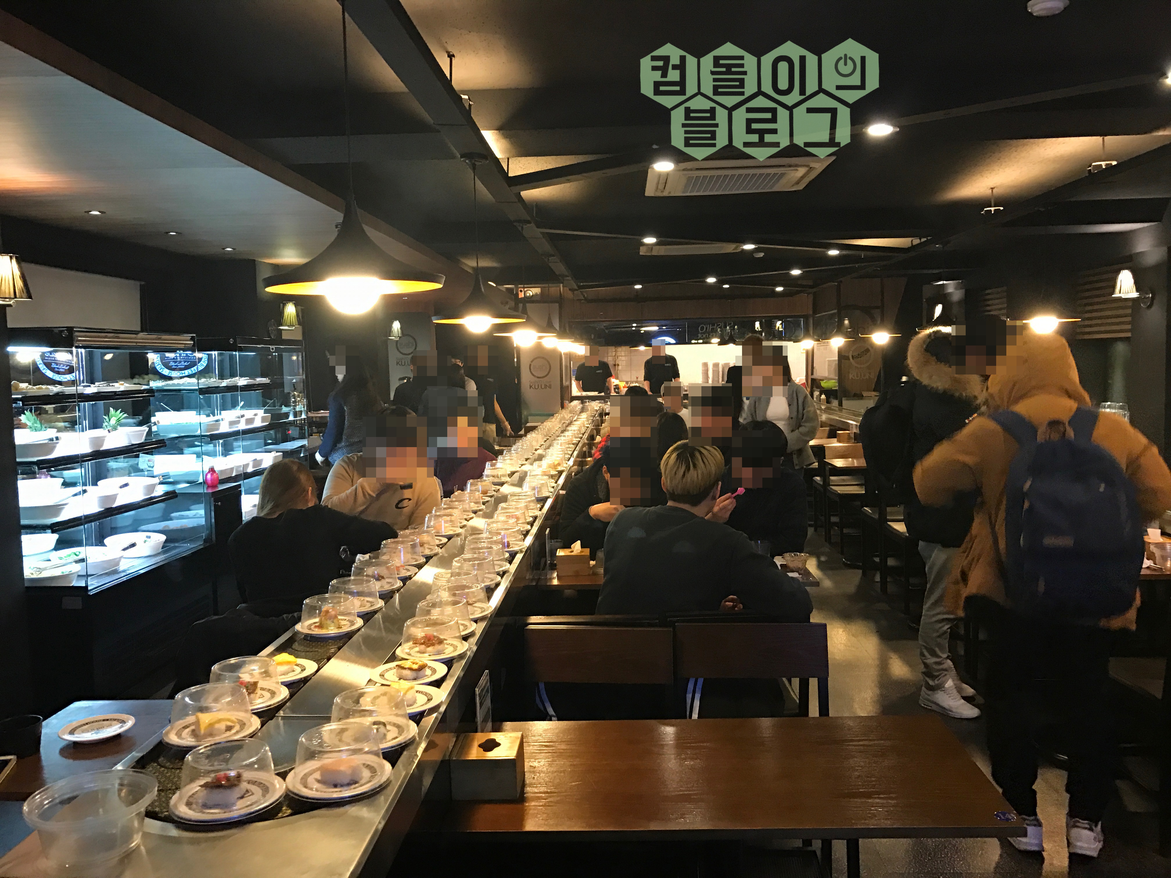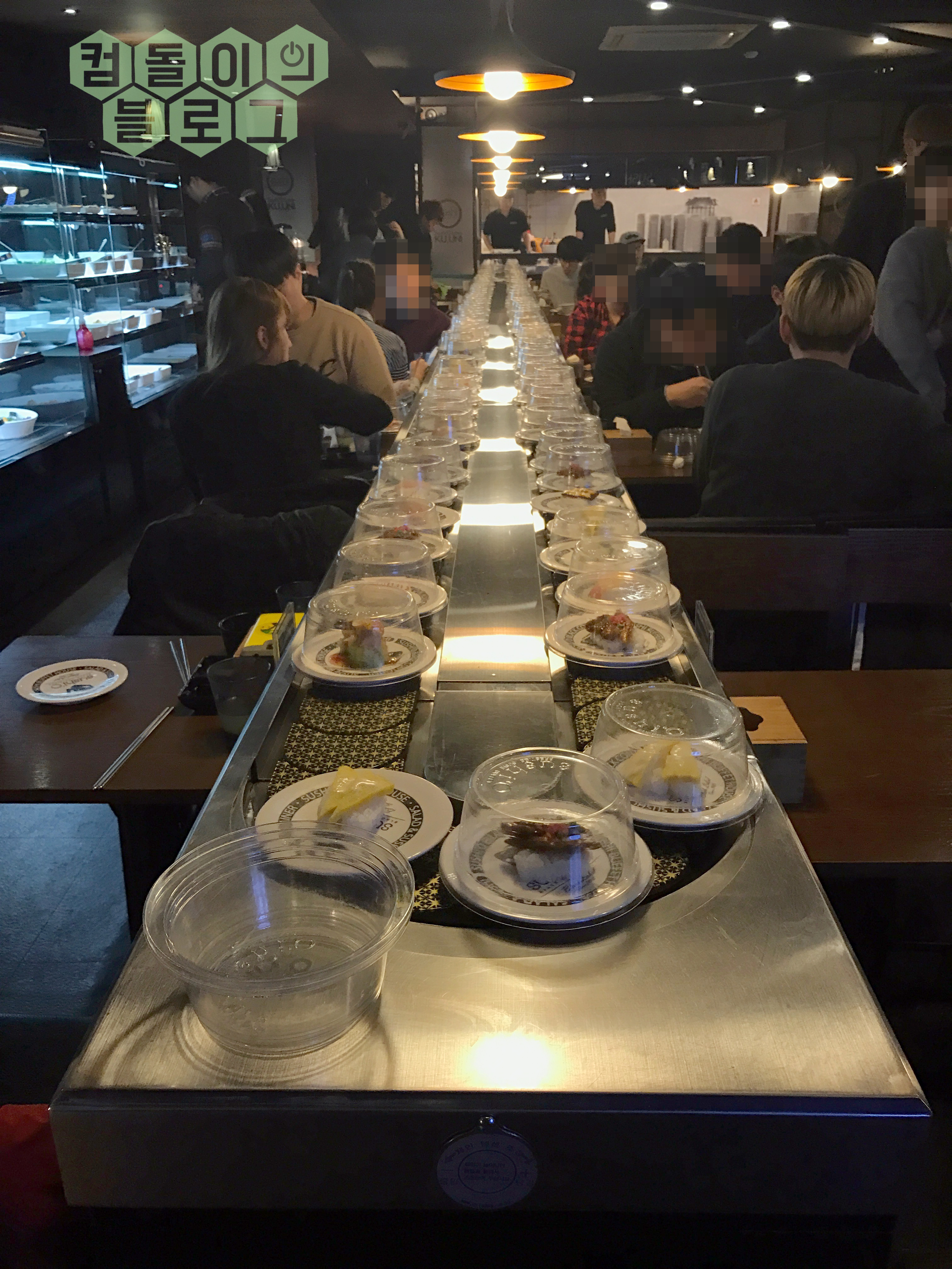 음식점의 구조는 왼쪽부터 샐러드바, 회전초밥, 식탁 순으로 배치가 되어있습니다.