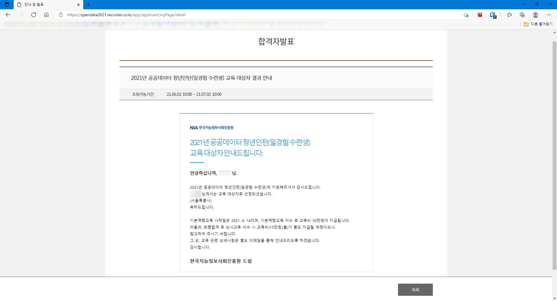 안녕하십니까, OOO님. 2021년 공공데이터 청년인턴(일경험 수련생) 모집에 지원해주셔서 감사드립니다.