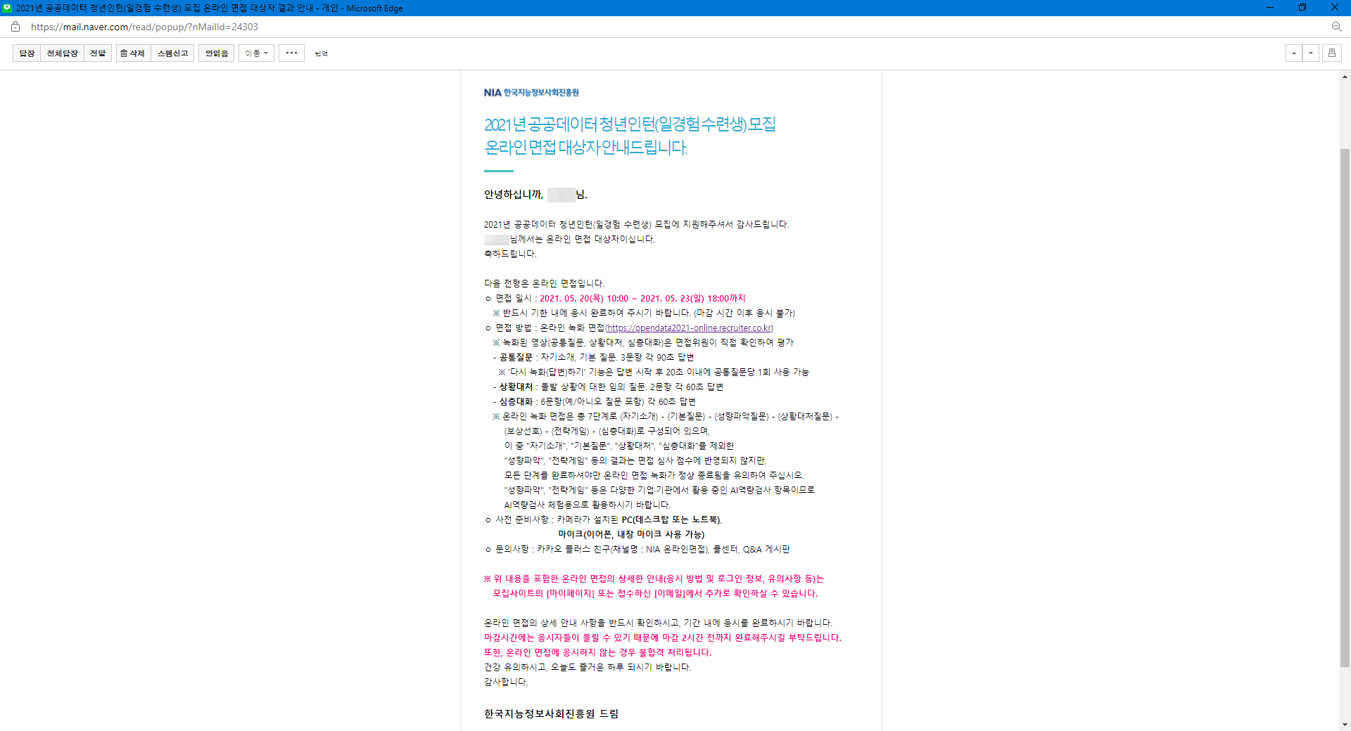 2021년 공공데이터 청년인턴(일경험 수련생) 모집 온라인 면접 대상자 안내드립니다.