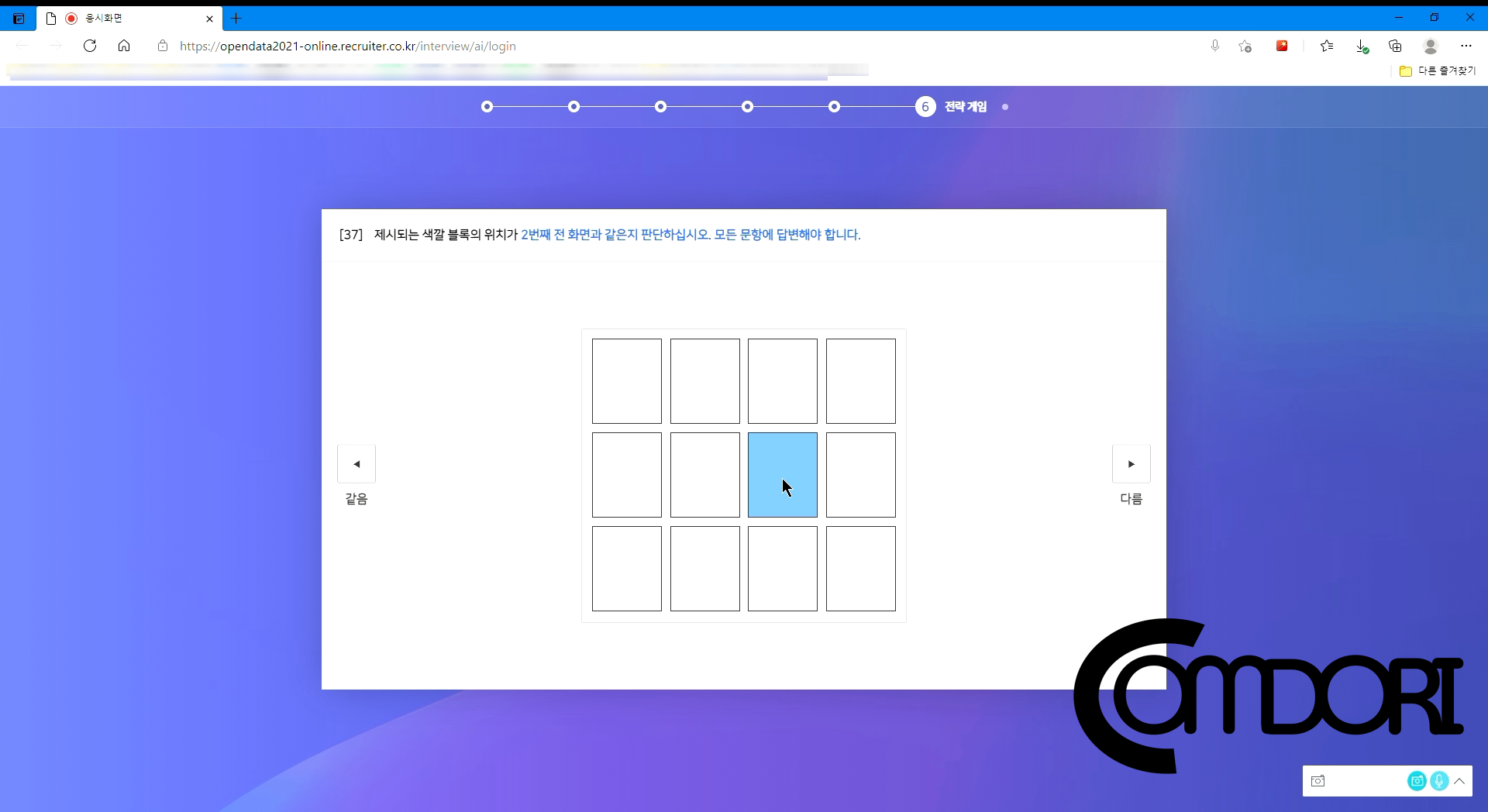 제시되는 색깔 블록의 위치가 2번째 전 화면과 같은지 판단하십시오. (카드 위치 기억력 게임)