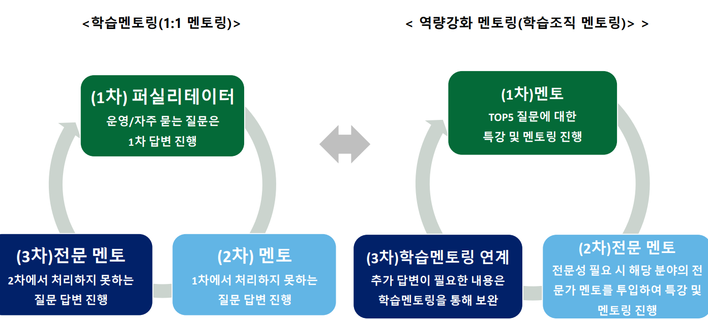 멘토링은학습멘토링에서최대한많은질문을빠르게해소하고역량강화멘토링을통해반복학습을통해전체역량이쌓이도록만들 어주는프로세스를가지고있습니다. 특히각단계가연계성을가지고운영되어순차적인문제해결이가능하도록서로보완관계를 가집니다.