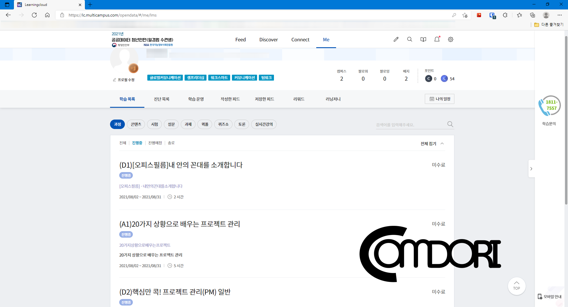 오른쪽의 미수료가 수료로 바뀌면 된다. (A가 들어가는 강의는 필수이므로 무조건 이수를 해야 하며 D가 들어가는 강의는 필수가 아니므로 이수하지 않아도 된다. 하지만 나는 미수료가 있으면 뭔가 불안해서 무조건 수료하는 편이다.)
