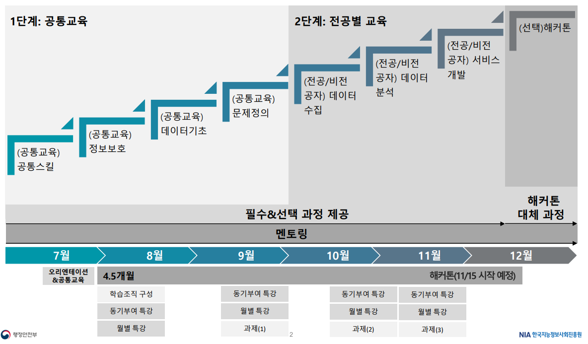 교육과정으로는 데이터 수집, 데이터 분석, 서비스 개발, 해커톤(선택과정)으로 진행된다. 10월~12월