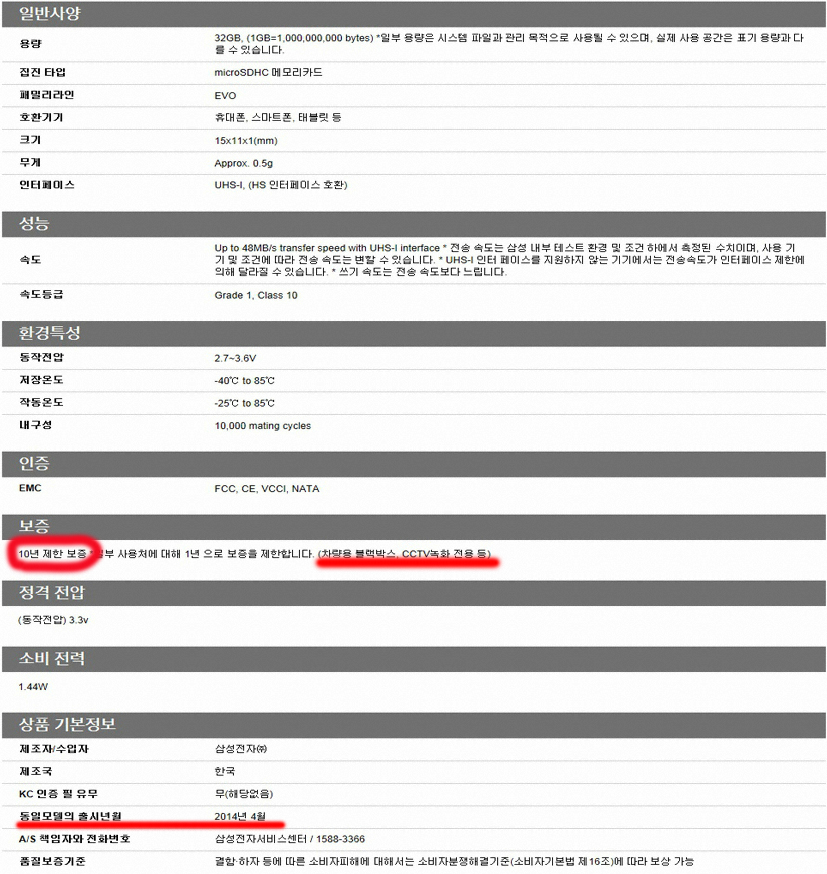 삼성 마이크로 SD 에보 모델은 보증을 10년 제한 보증합니다.(블박, CCTV용은 제한)