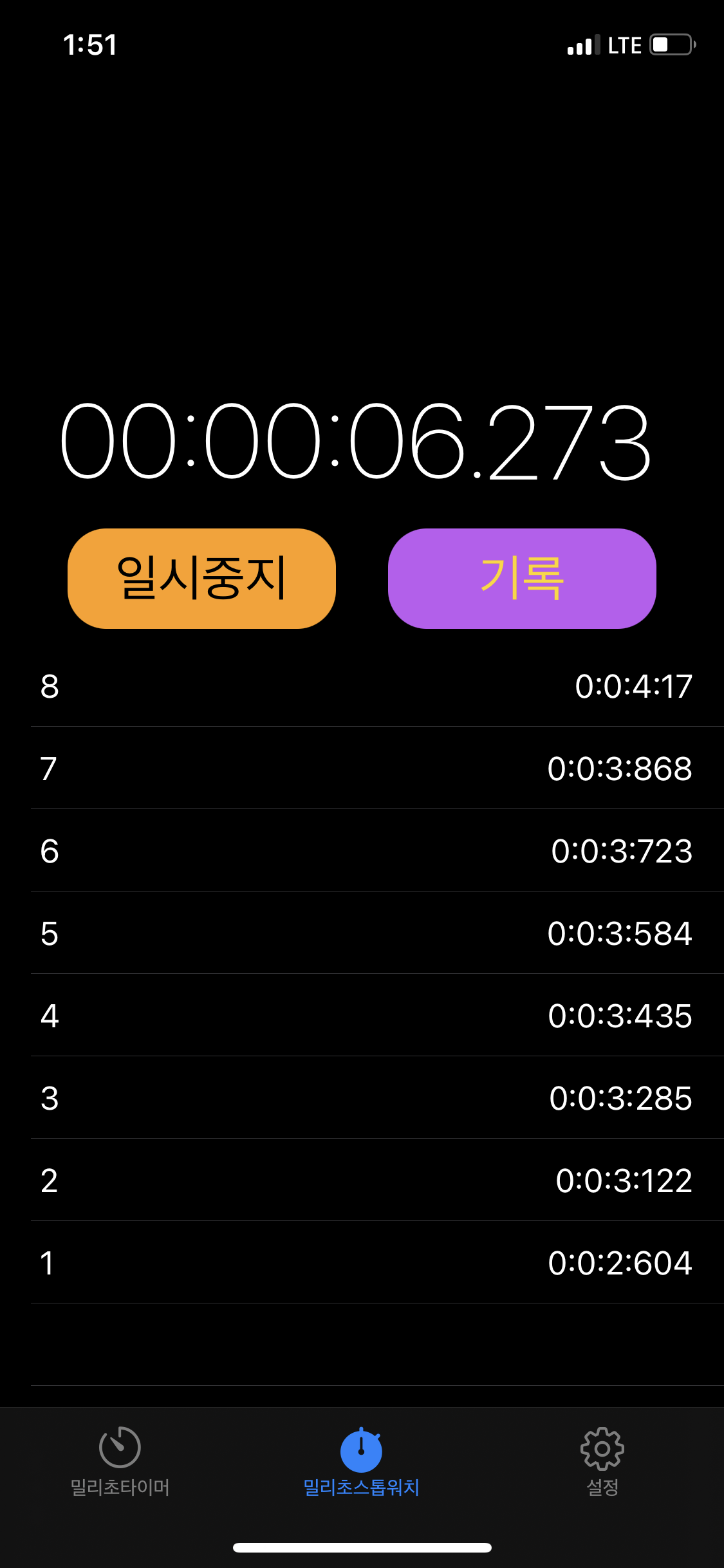 또한 iOS 기본 시계 앱에서 스톱워치를 사용할 때 소수점 2자리만 표시되어 정확한 밀리초가 안 보여서 아쉽죠?