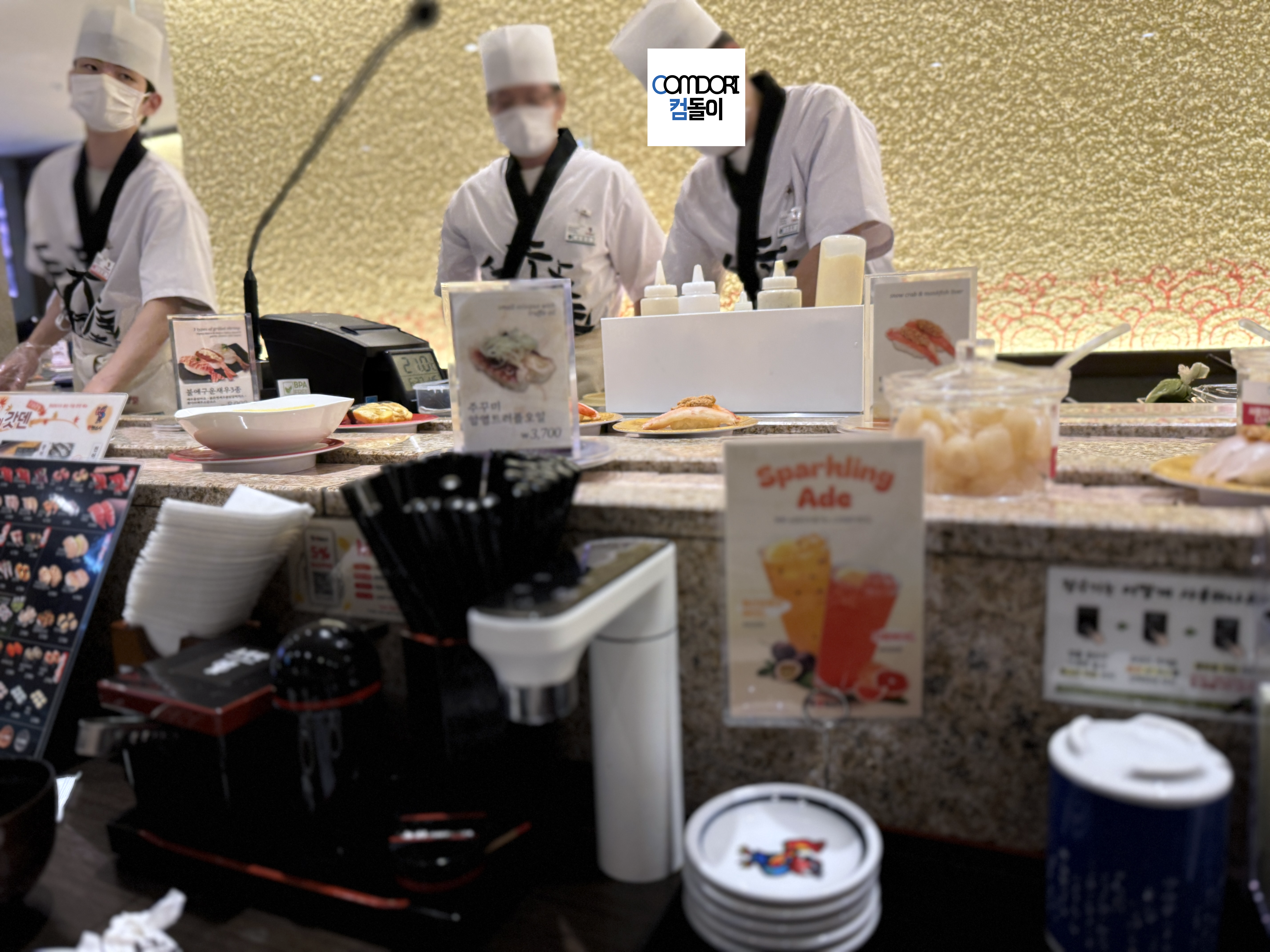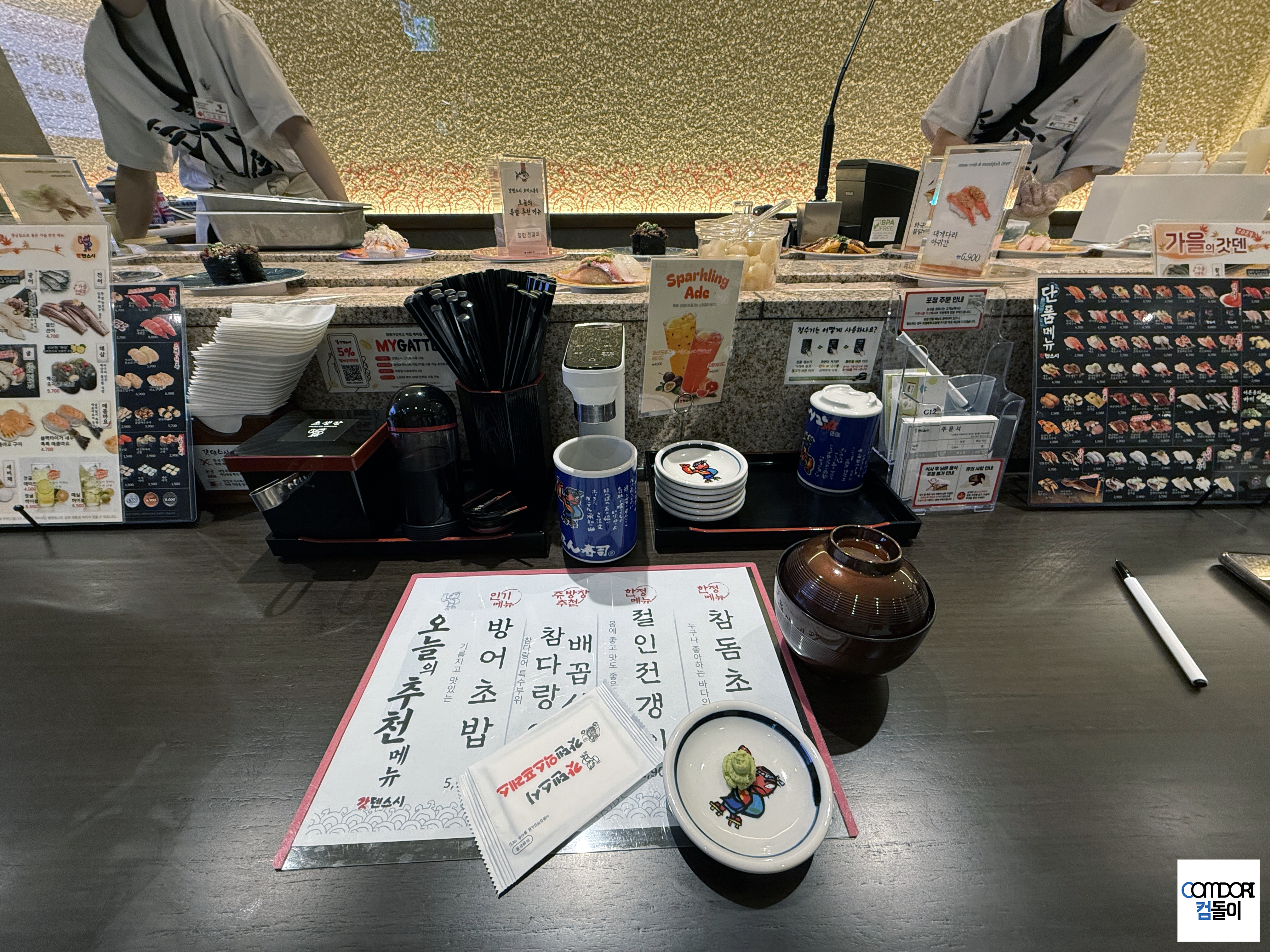 기본적으로 회전초밥레일이 있고 1인 좌석으로 되어 있어서 원하는 초밥을 주문하거나 레일에서 가져다 먹는 방식입니다.