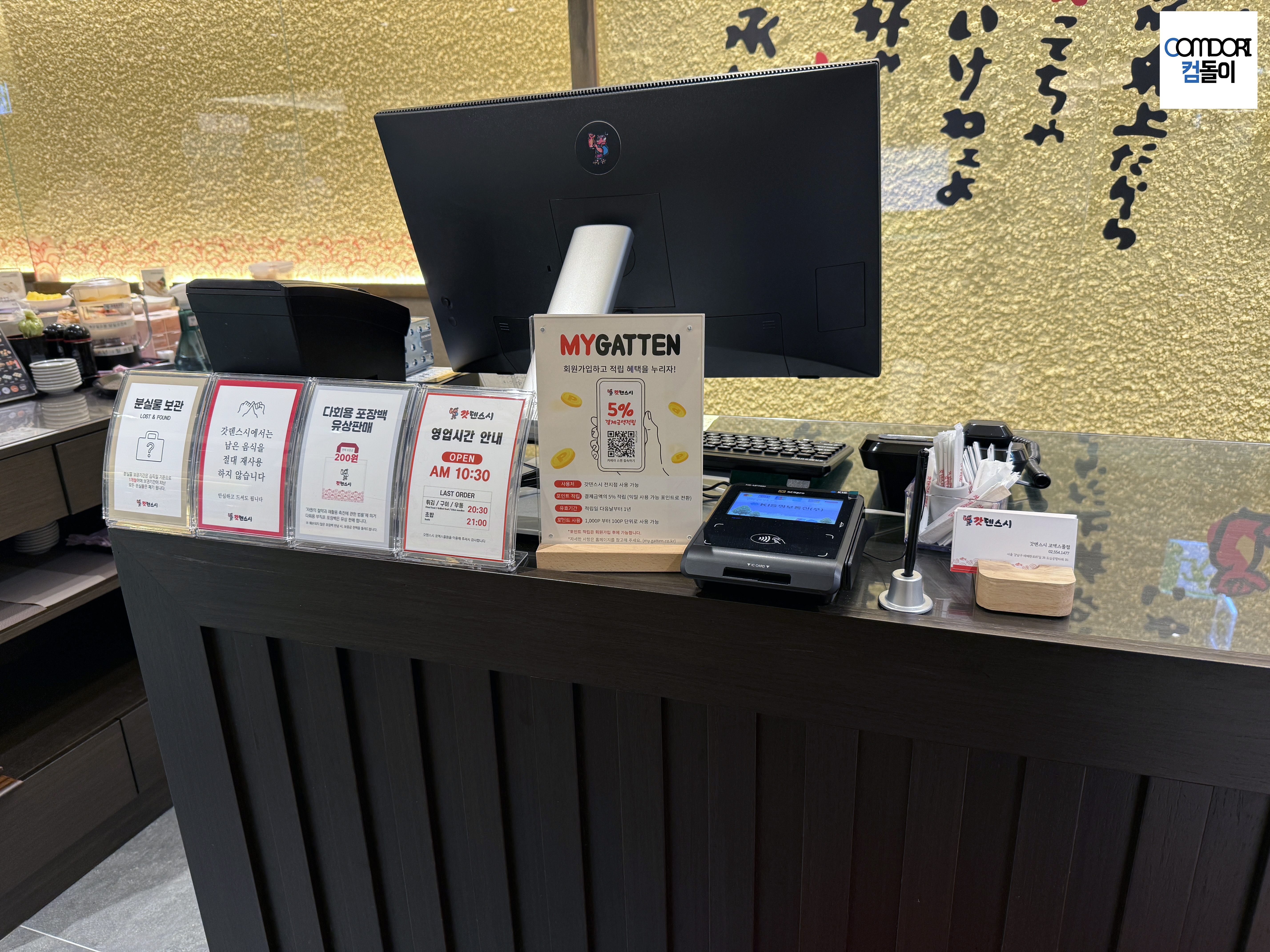 계산대입니다. 영업시간하고, 갓덴스시 멤버십가입 시 결제금액 5% 적립을 할 수 있는 홍보물이 있습니다.
