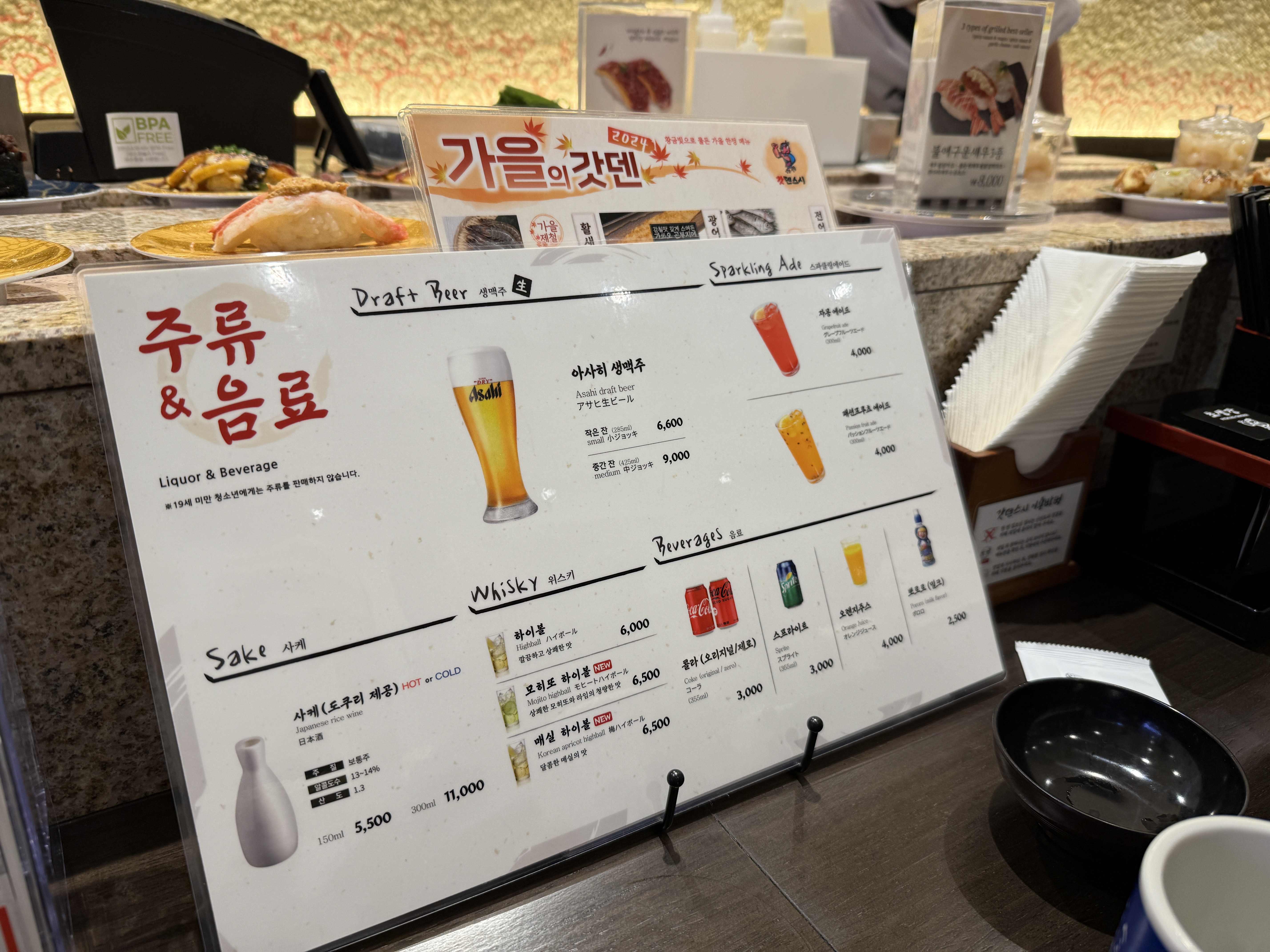 주류와 음료 또한 일본식 초밥집답게 아사히 생맥주가 기본이었고, 자몽에이드, 사케, 위스키, 콜라 등 다양하게 판매 중이었습니다만, 친구들과 2차에서 하기로 하고 패스하였습니다.