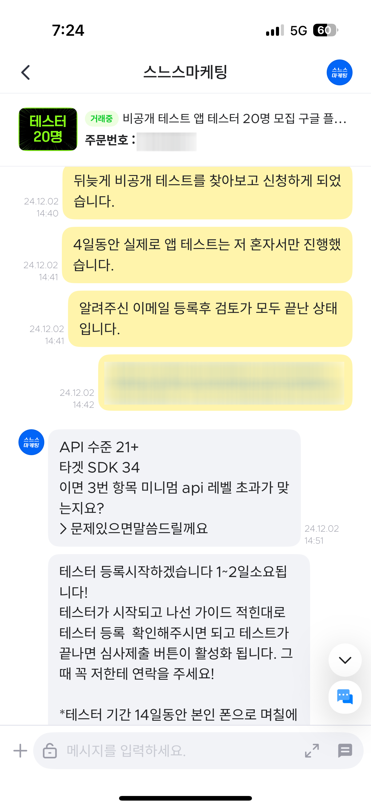 10. 현실적으로 매일 앱을 테스트할 인원이 부족하여 관련 정보를 찾다 보니 크몽이라는 프리랜서/아웃소싱 플랫폼에서 비공개 테스트 통과 서비스를 찾음