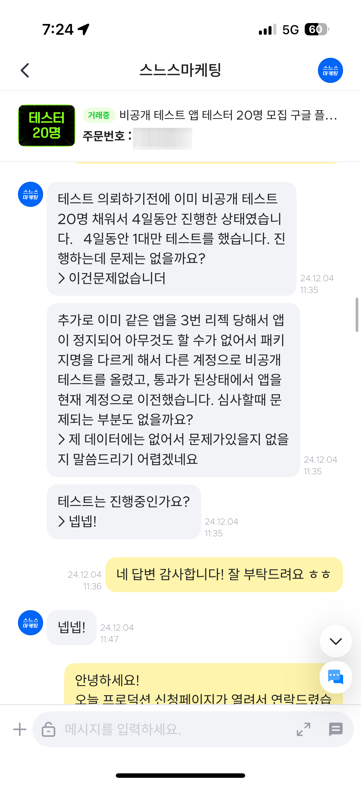 테스트를 진행하면서 사소한 질문에도 친절하게 답변해 주셨고, 기존에도 앱이 삭제되는 초유의 불상사가 있었던지라 걱정이 많았는데, 끝까지 책임지고 진행해 주셔서 감사했습니다.