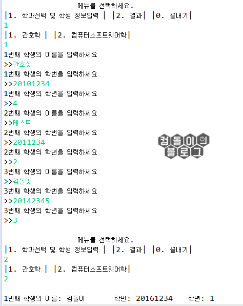 if("1".equals(Menu)){ //1번을 입력받았을 경우 학과 선택후 바로 학생 정보를 입력