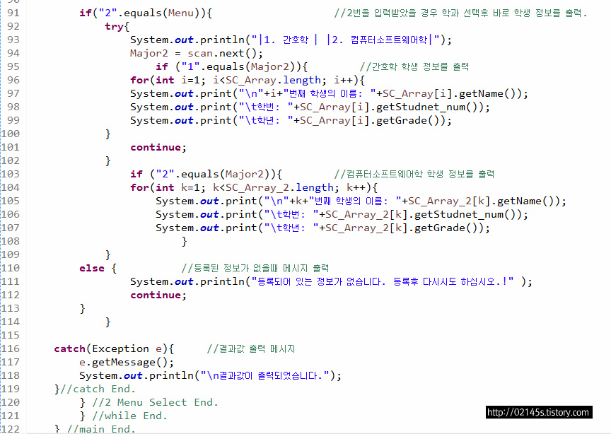 if("2".equals(Menu)){ //2번을 입력받았을 경우 학과 선택후 바로 학생 정보를 출력.