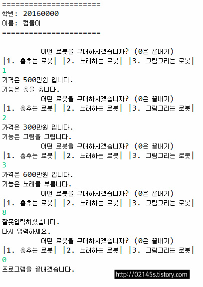 else if ("1".equals(Menu)) { // 1번 메뉴를 선택시 춤추는 로봇의 정보를 나타냄.