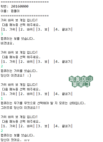 } else if (user == 2 && com == 3 || com == 0) { // 사용자가 바위를 냈을때 컴퓨터는 보자기를 내므로 사용자는 패배.