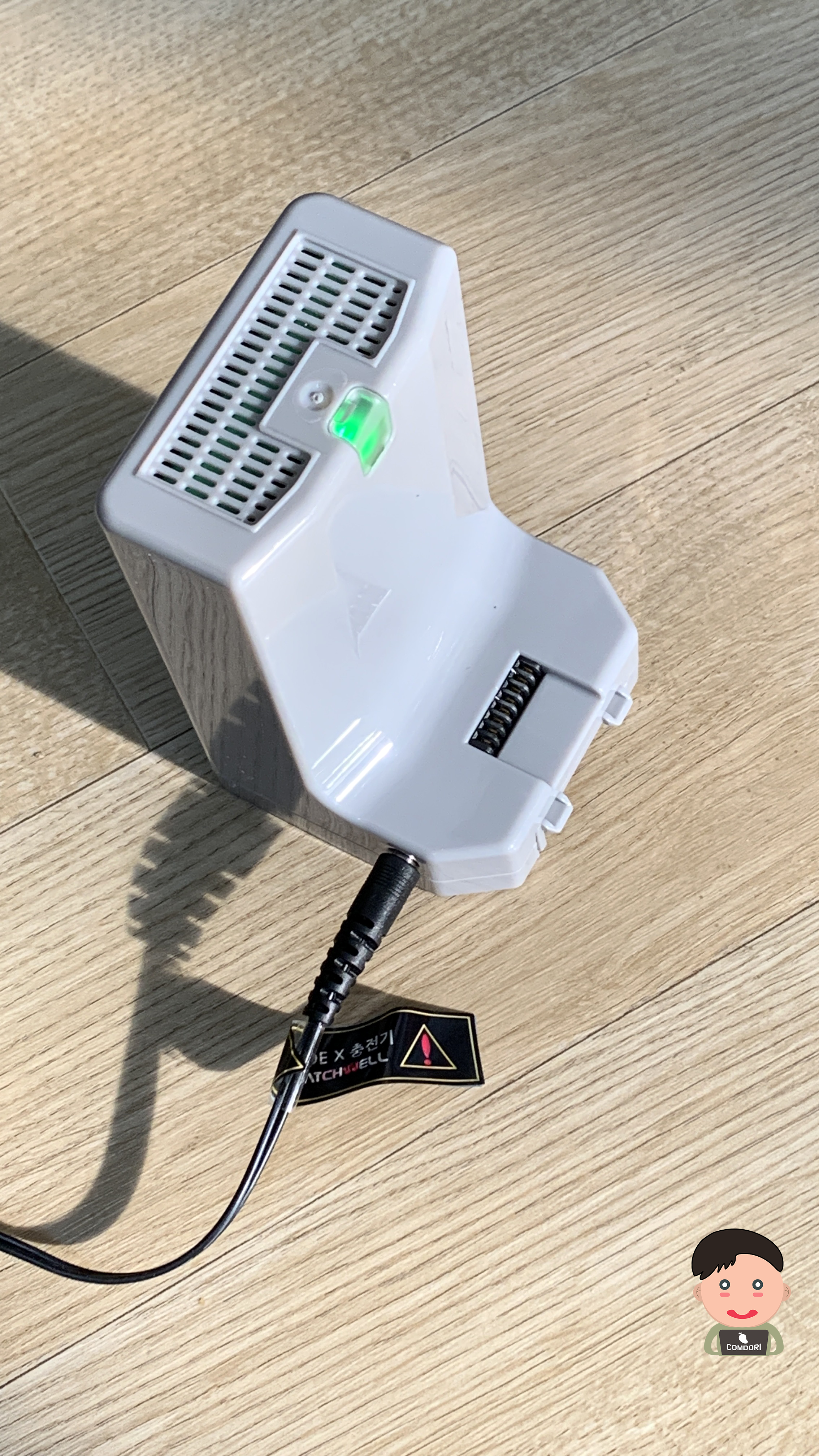 기존에 사용하던 cv6는 배터리가 분리가 안되었는데 이번 코드엑스는 배터리가 분리돼서 저렇게 사진처럼 충전할 수 있다. 초록색 LED가 깜빡거리면서 충전이 진행된다.