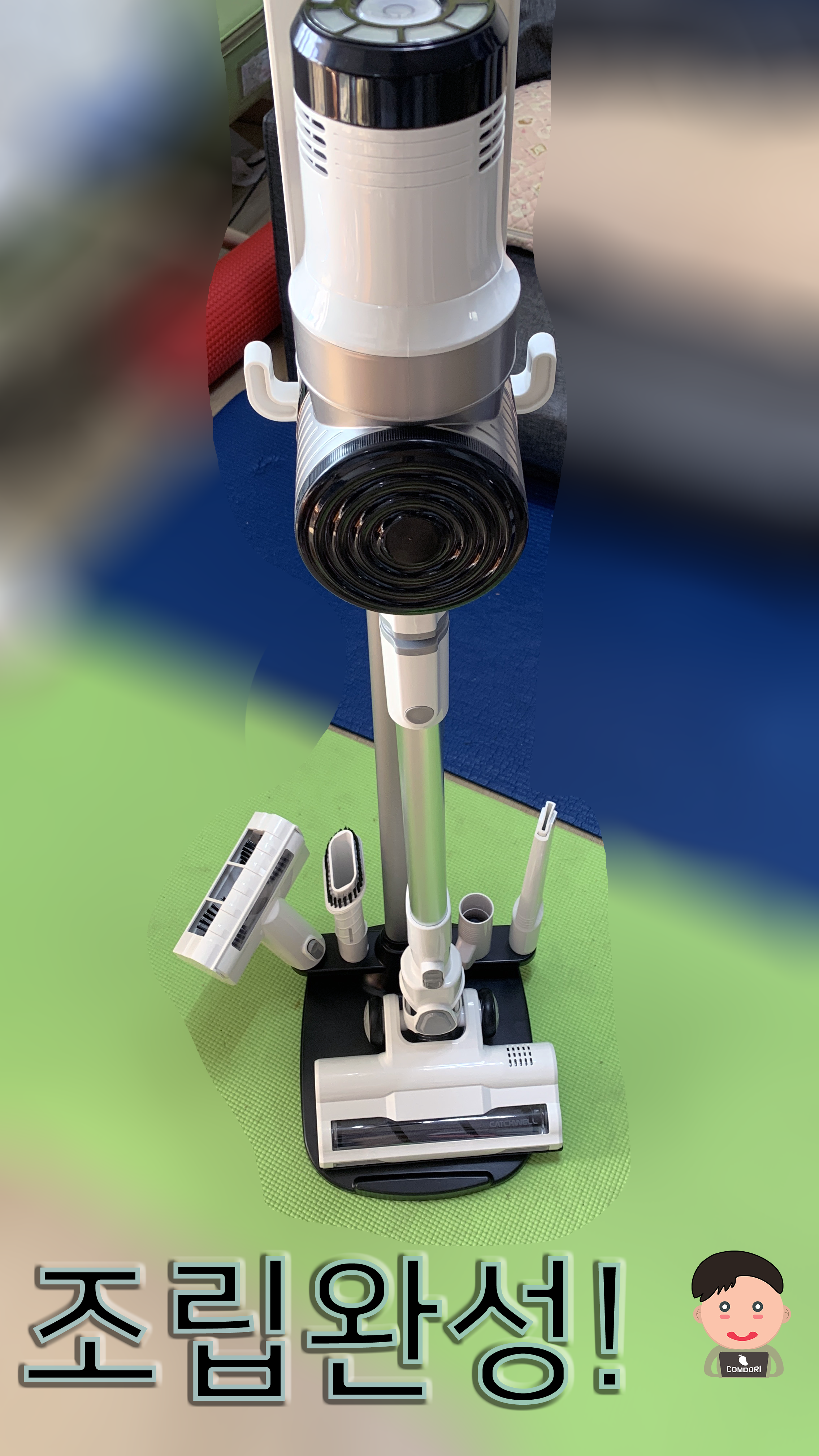 조립을 완성하고 전체 풀샷을 남겨보았다. 아쉬운 점이 거치대에 자석이 있어서 청소기를 딱 가져다 대면 붙긴 하는데 거치대 자체에는 충전 기능이 없어서 옆면에 충전기를 연결해야 하는 불편함이 생긴다.