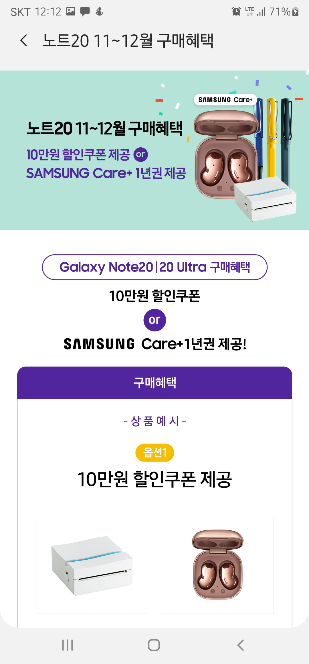 혜택은 20년 11월~12월 기준 갤럭시 위치3 할인, 레더 커버, 삼성 케어+ 1년 이용권이었다.