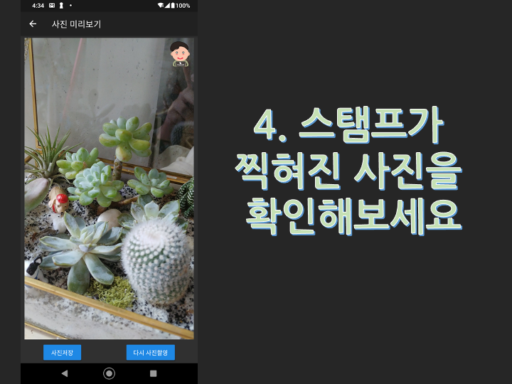 1. 스탬프 위치를 한번 설정해놓으면 이어서 연속 촬영이 가능합니다.